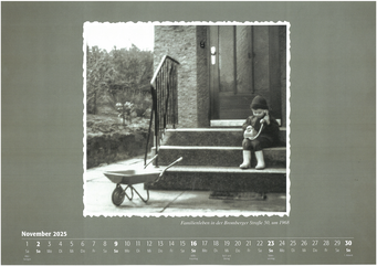 Das Foto zeigt ein Kind auf der Treppe vor der Haustür in der Bromberger Straße 50, vertieft ins Spiel mit einem Telefon. Ende der 1960er-Jahre hielten die ersten Telefonanschlüsse Einzug in die Heidesiedlung – ein Stück moderner Alltag, das den Bewohnerinnen und Bewohnern neue Möglichkeiten der Kommunikation eröffnete. Das Bild erinnert daran, wie eng Technik und Familienleben schon damals miteinander verbunden waren.